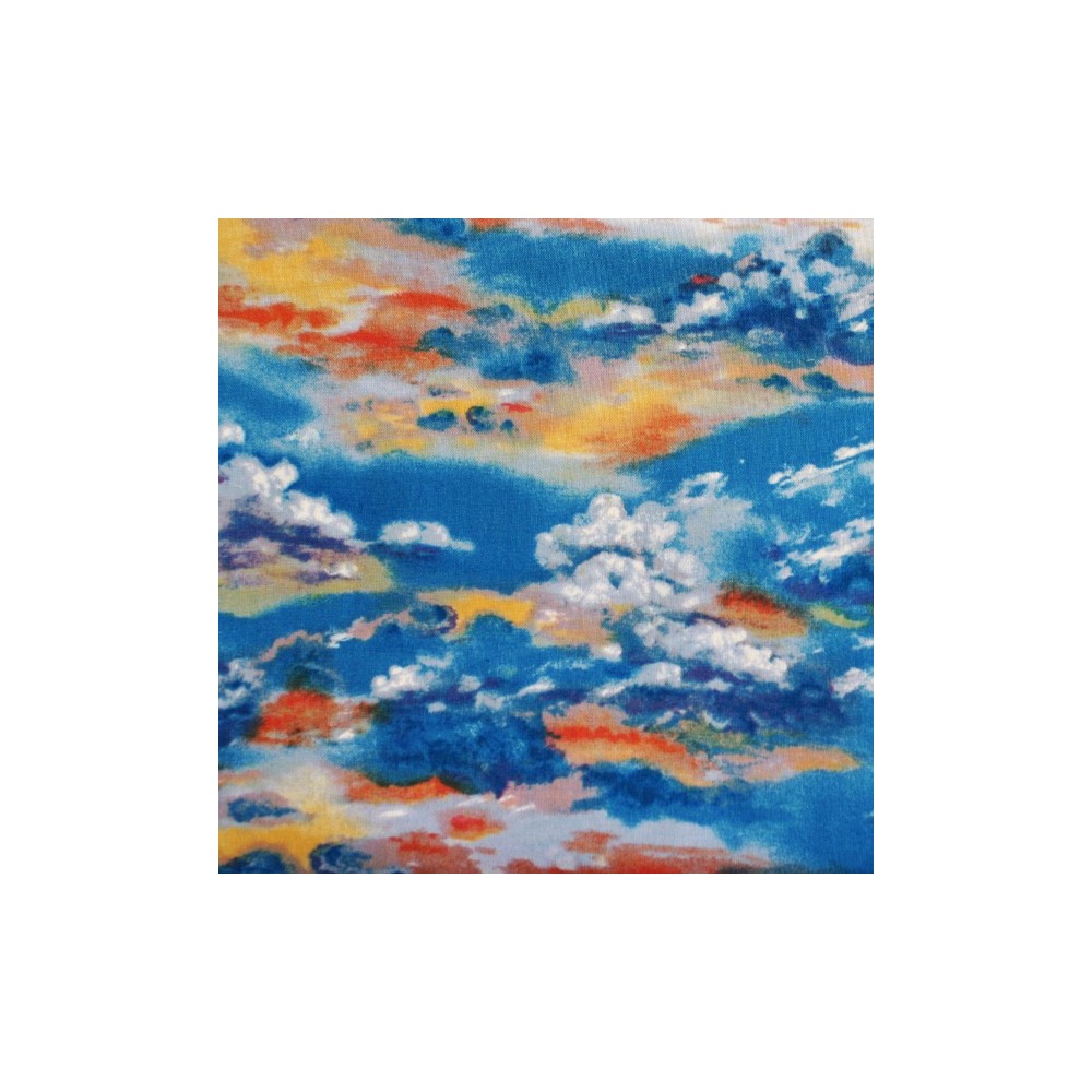 Tela de patchwork con motivos de naturaleza, abstracto de cielo con nubes y tonos que asemejan el atardecer.